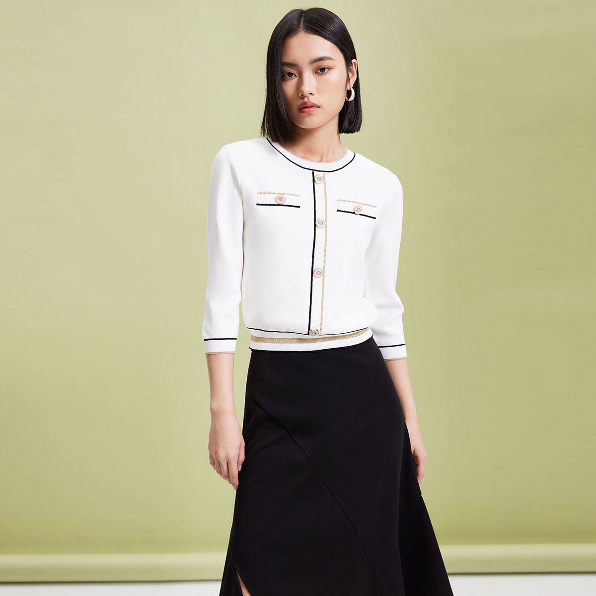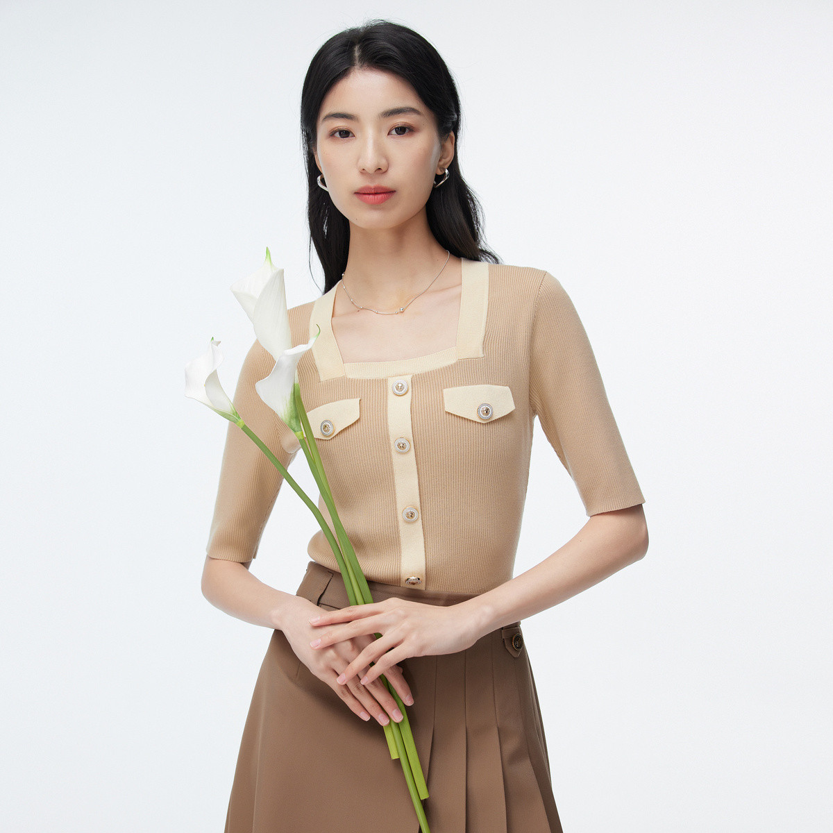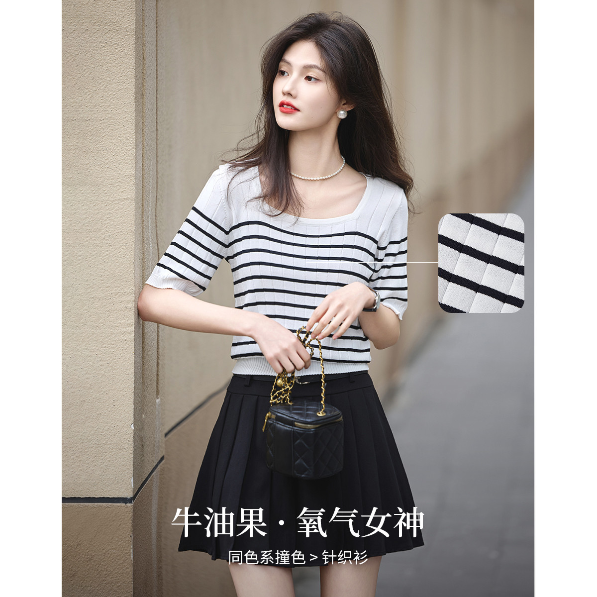 装饰扣五分袖方领针织衫女夏百搭撞色通勤显瘦气质上衣女 752899