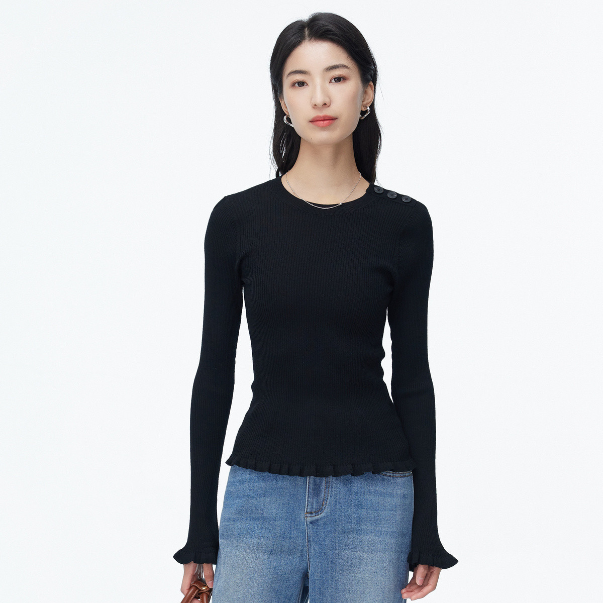 喇叭袖圆领针织衫女春秋基础百搭打底衫简约修身显瘦长袖毛衣女 900099
