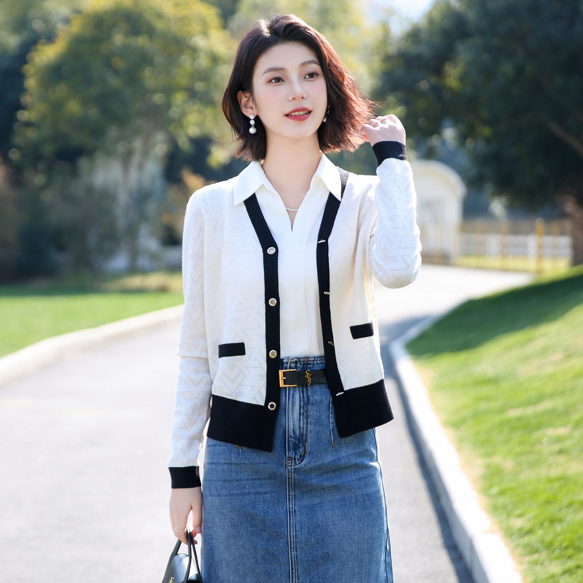 春秋新款高级撞色针织开衫女式气质优雅日常通勤上衣外套 591199