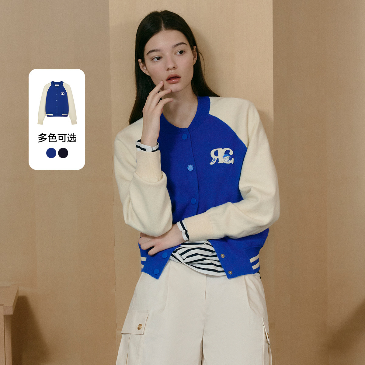 小熊女装秋冬款小香风毛针织开衫时髦撞色外套 188865
