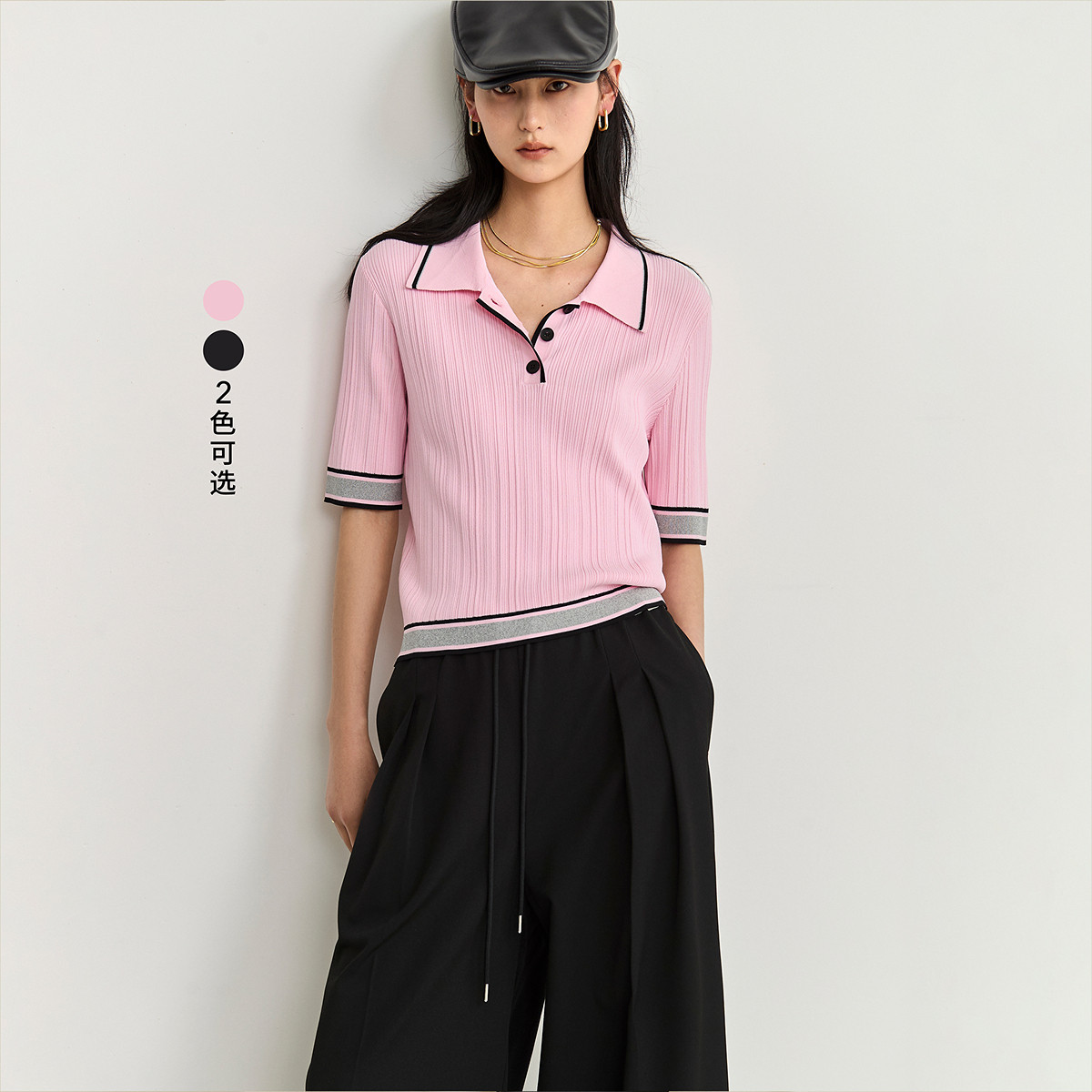 春秋款纯绵羊毛条纹小翻领拼色设计感修身套头针织衫朗姿集团 001497