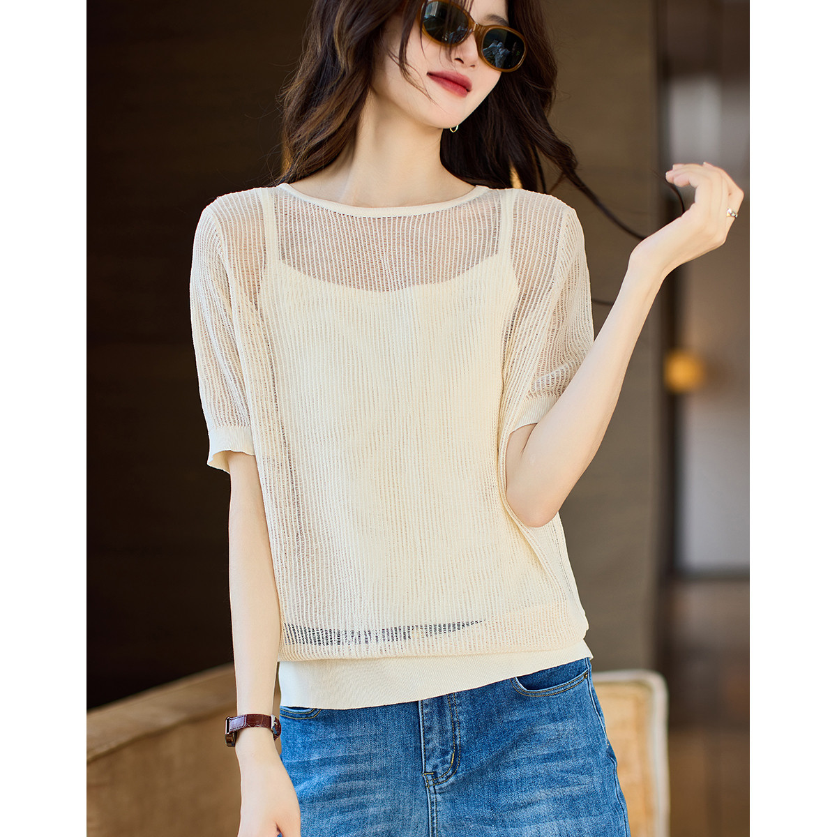 小众镂空针织衫女2025春夏新款短袖罩衫透气舒适短袖T恤外搭 372873