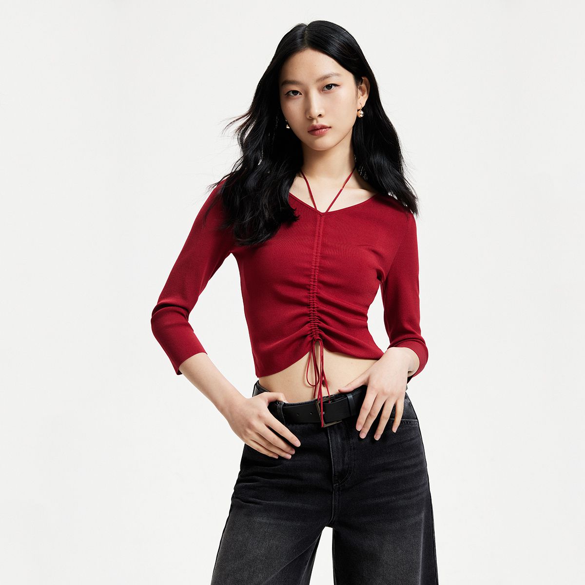 【露锁骨上衣女】春季款纯欲针织衫女抽绳设计长袖针织 985931