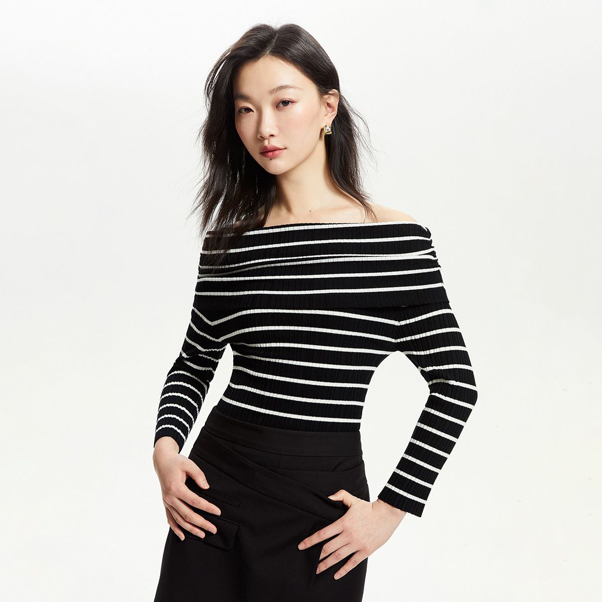 针织衫女一字领条纹短款七分袖修身时尚 863505