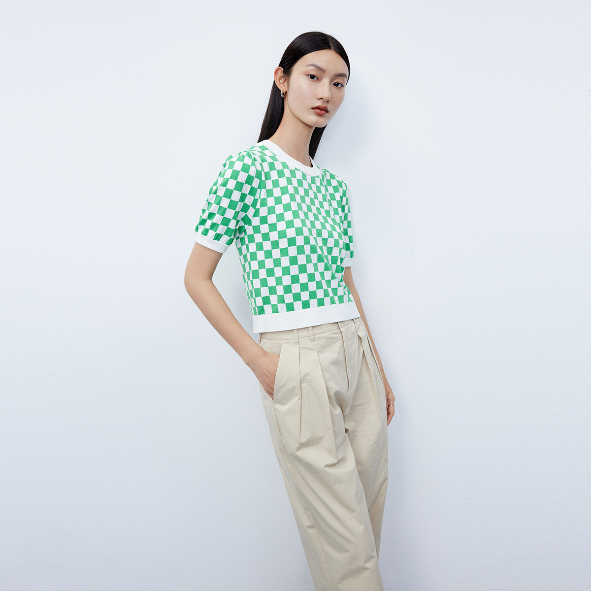【商场同款】春季款复古棋盘格纹短袖毛针织衫小上衣 974811