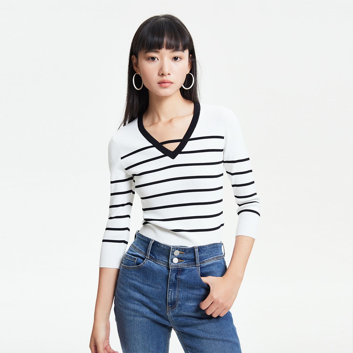 【V领领型】简约舒适条纹七分打底衫针织衫 783441