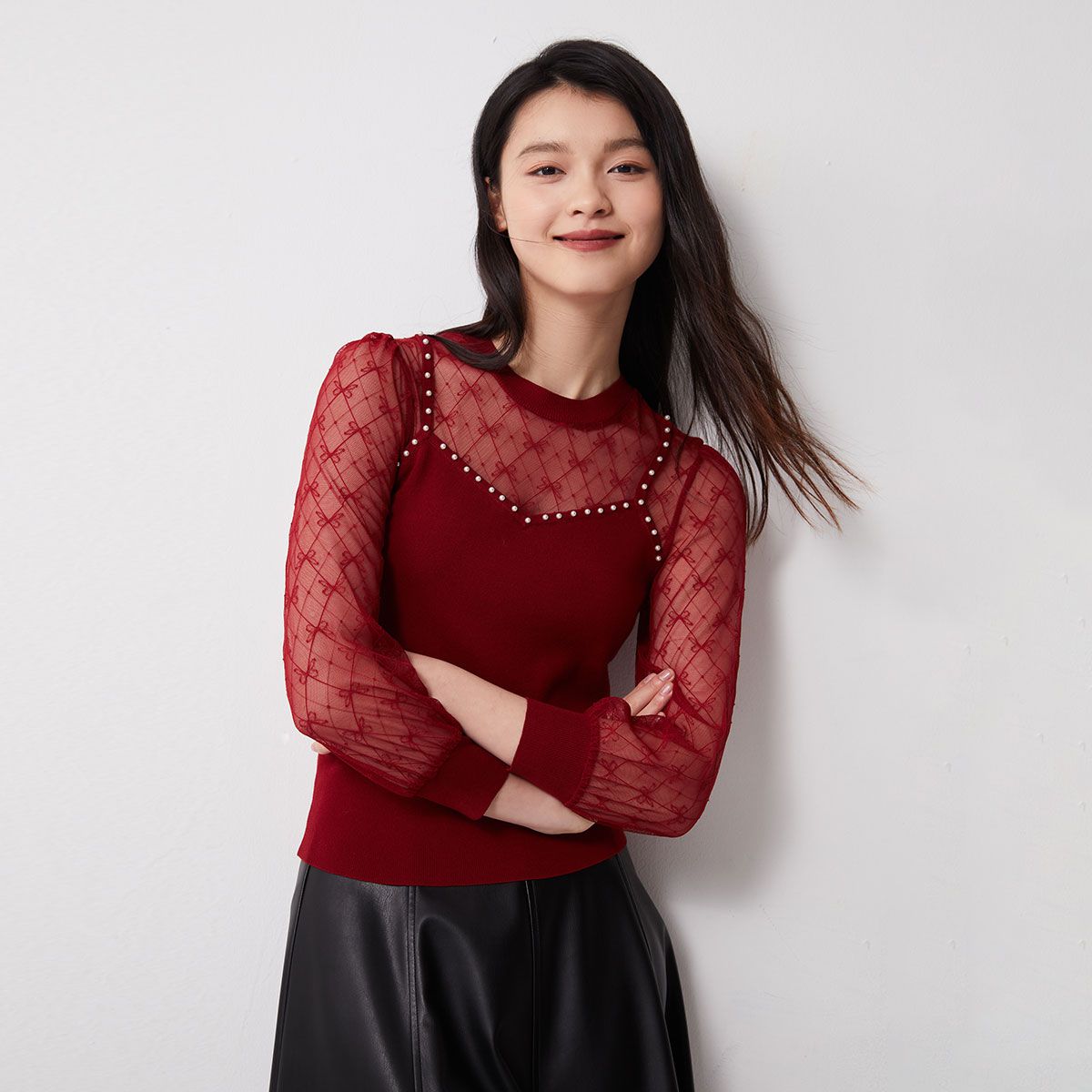 针织衫女时尚女人百搭气质透视显瘦七分袖 472465