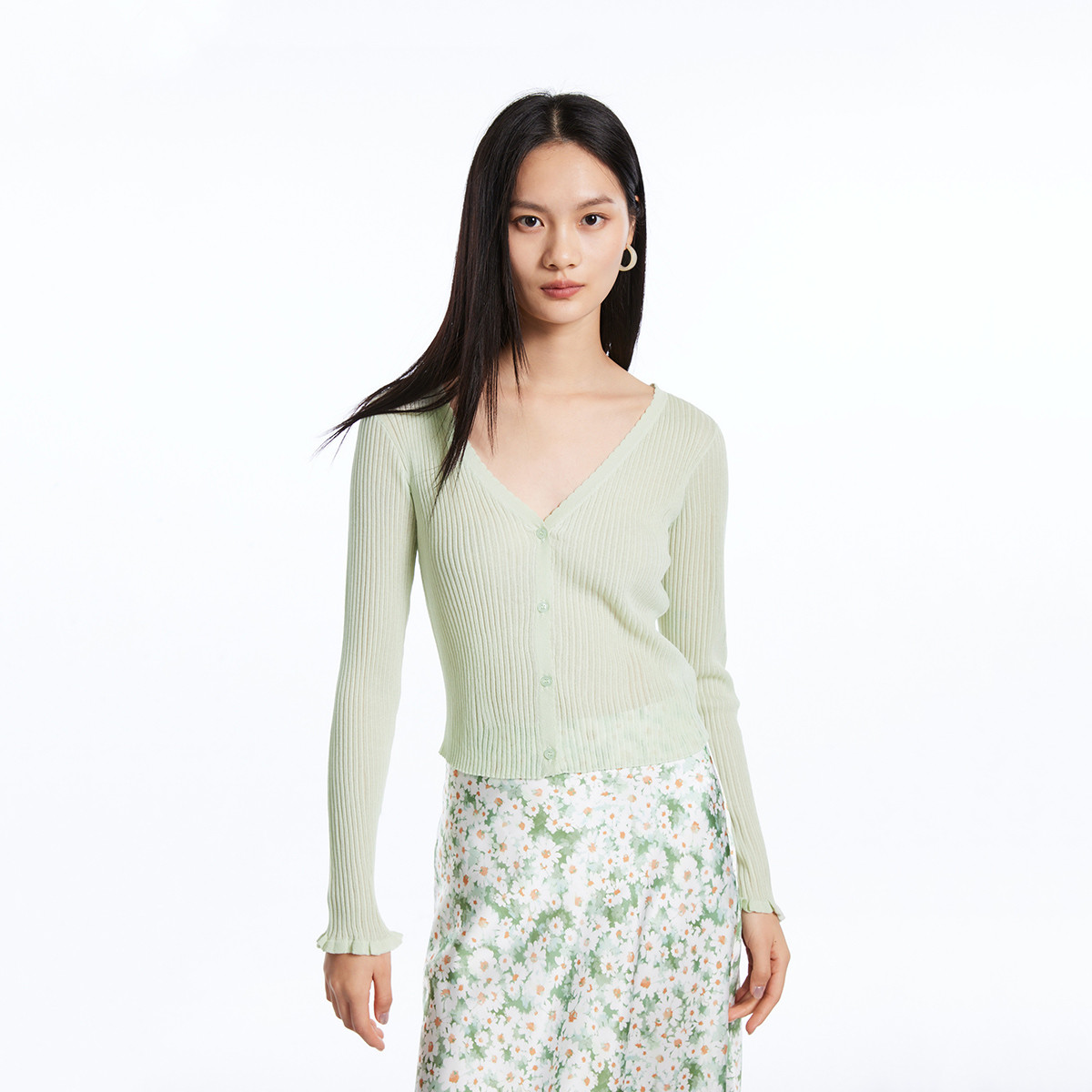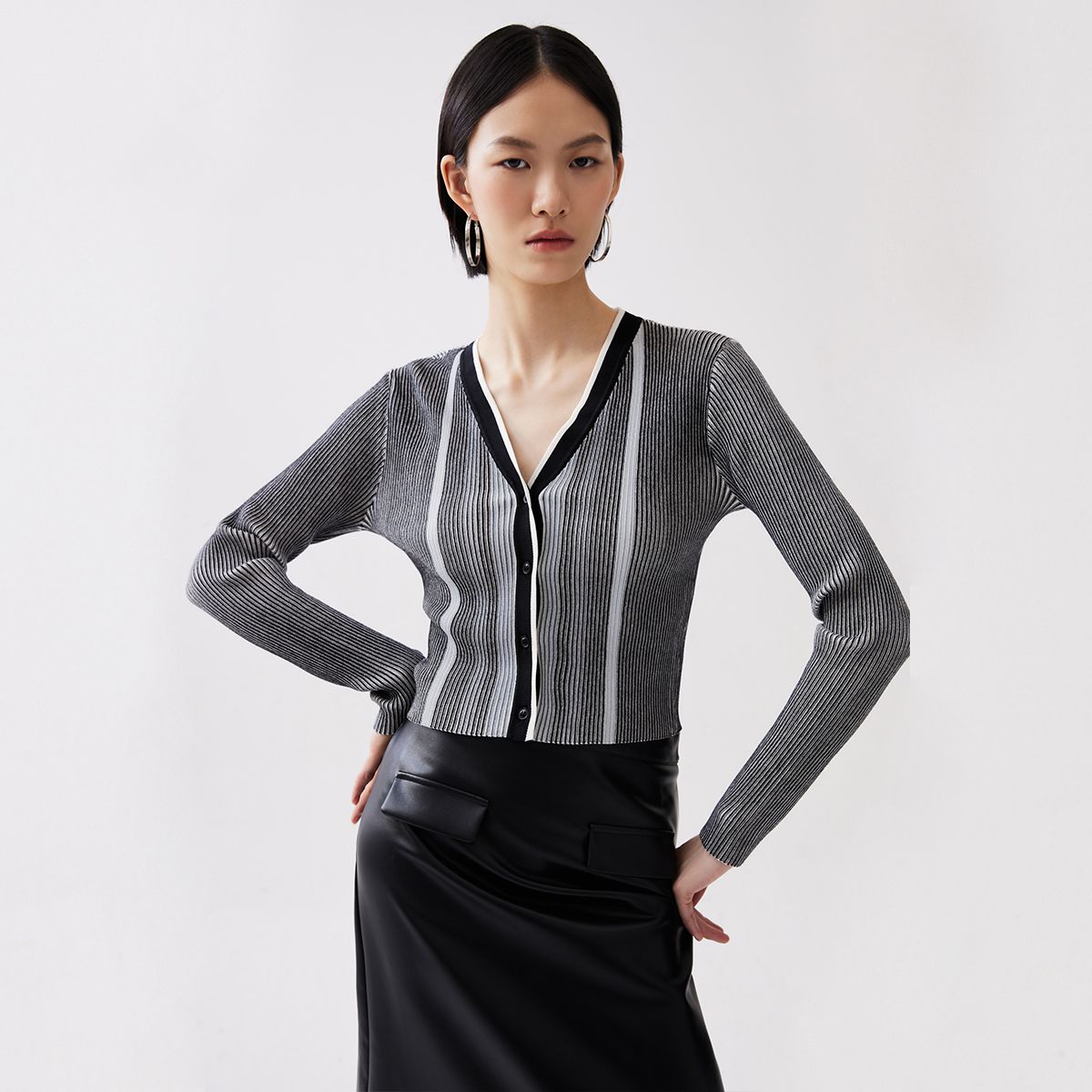 【柔软开衫】针织衫女修身短款V领坑条弹力长袖通勤空调衫外搭 509713
