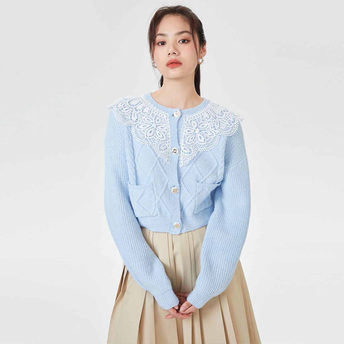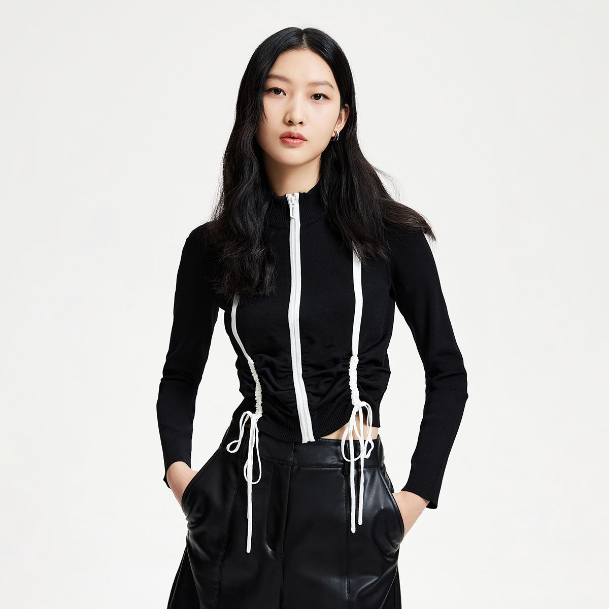 【抽褶设计】针织开衫女修身立领抽褶设计感简约百搭 565457