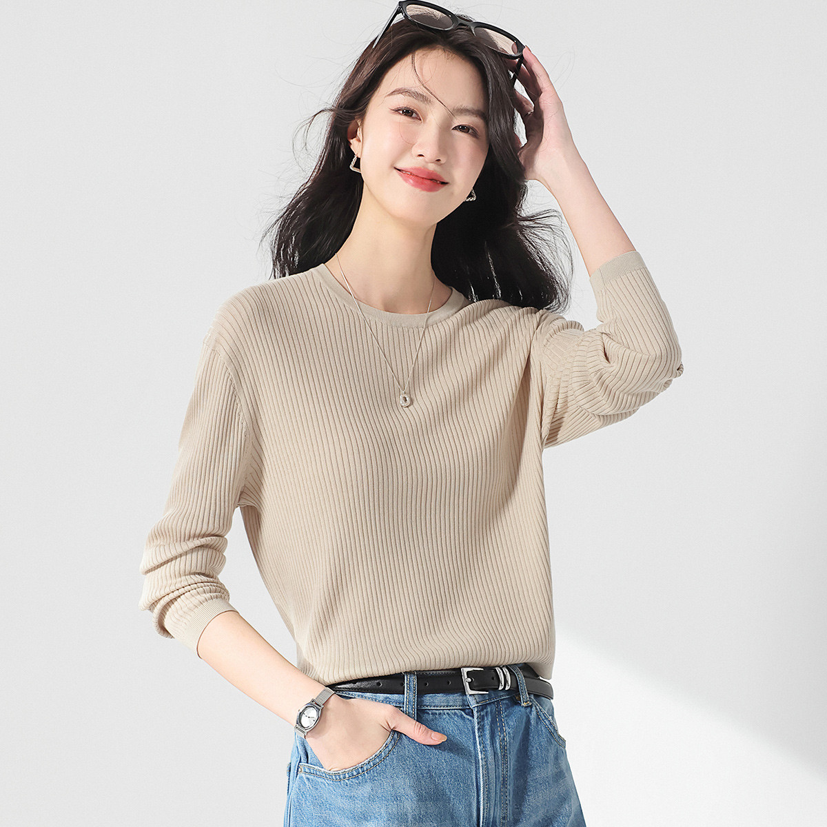 春款轻薄透气含桑蚕丝纯色坑条圆领基础针织打底衫长袖T恤针织衫 804819