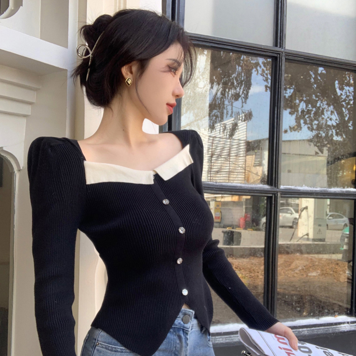 方领针织衫女短打底衫女设计感长袖针织上衣 171331