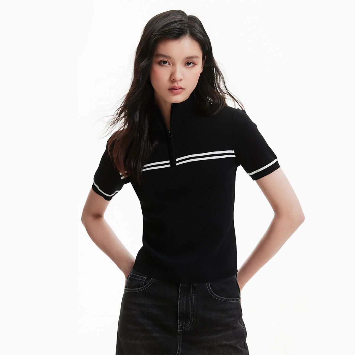 【条纹撞色】针织衫女黑白撞色修身半高领拉链短袖上衣 418833