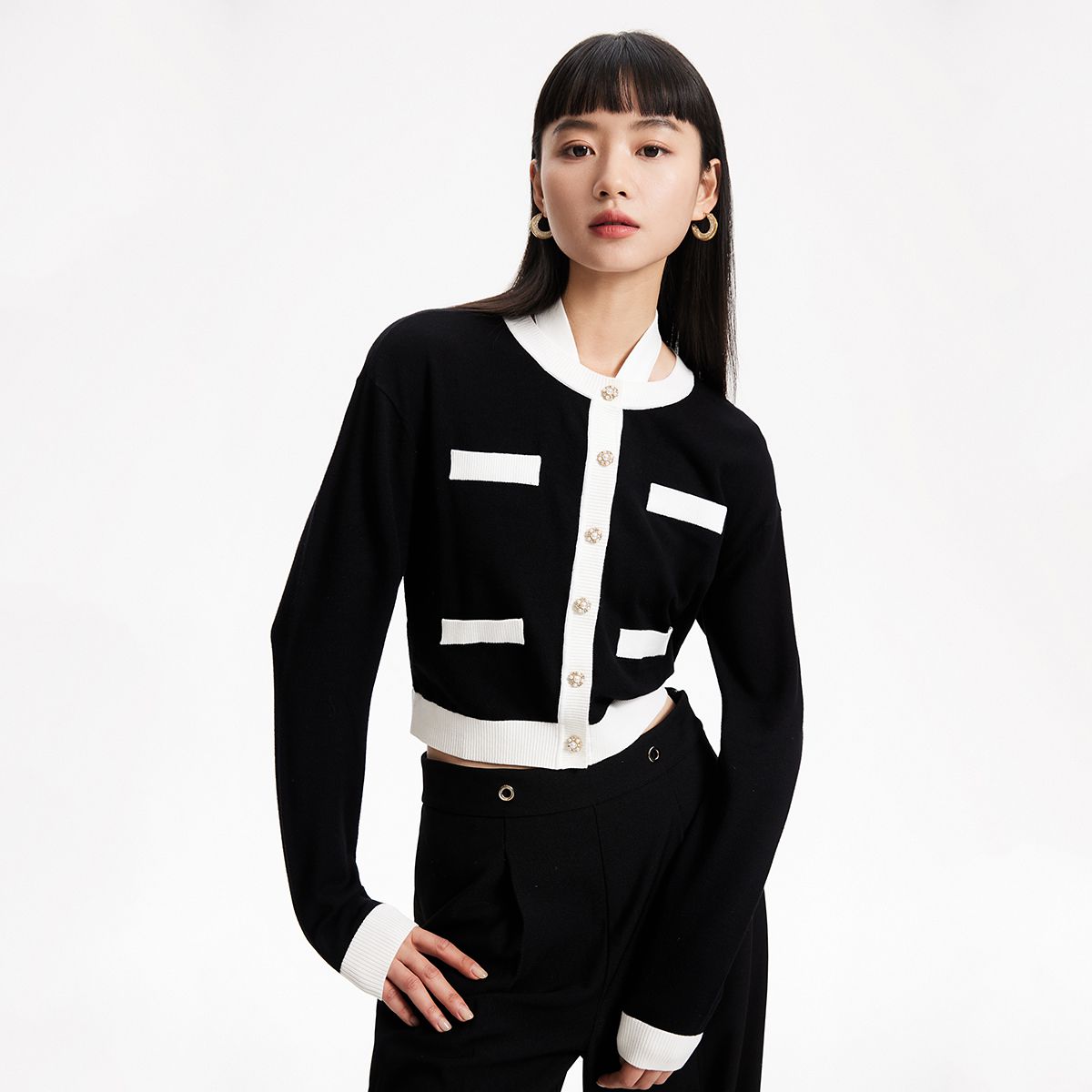 春秋新款高级撞色针织开衫女式气质优雅日常通勤上衣外套 591199