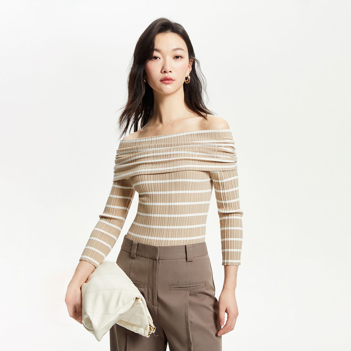 针织衫女一字领条纹短款七分袖修身时尚 896273