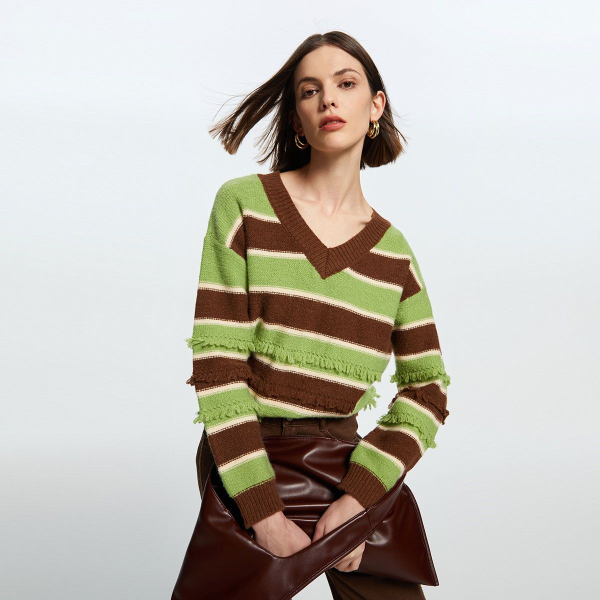 【休闲舒适】2024春季V领撞色条纹流苏长袖毛衣女 681489