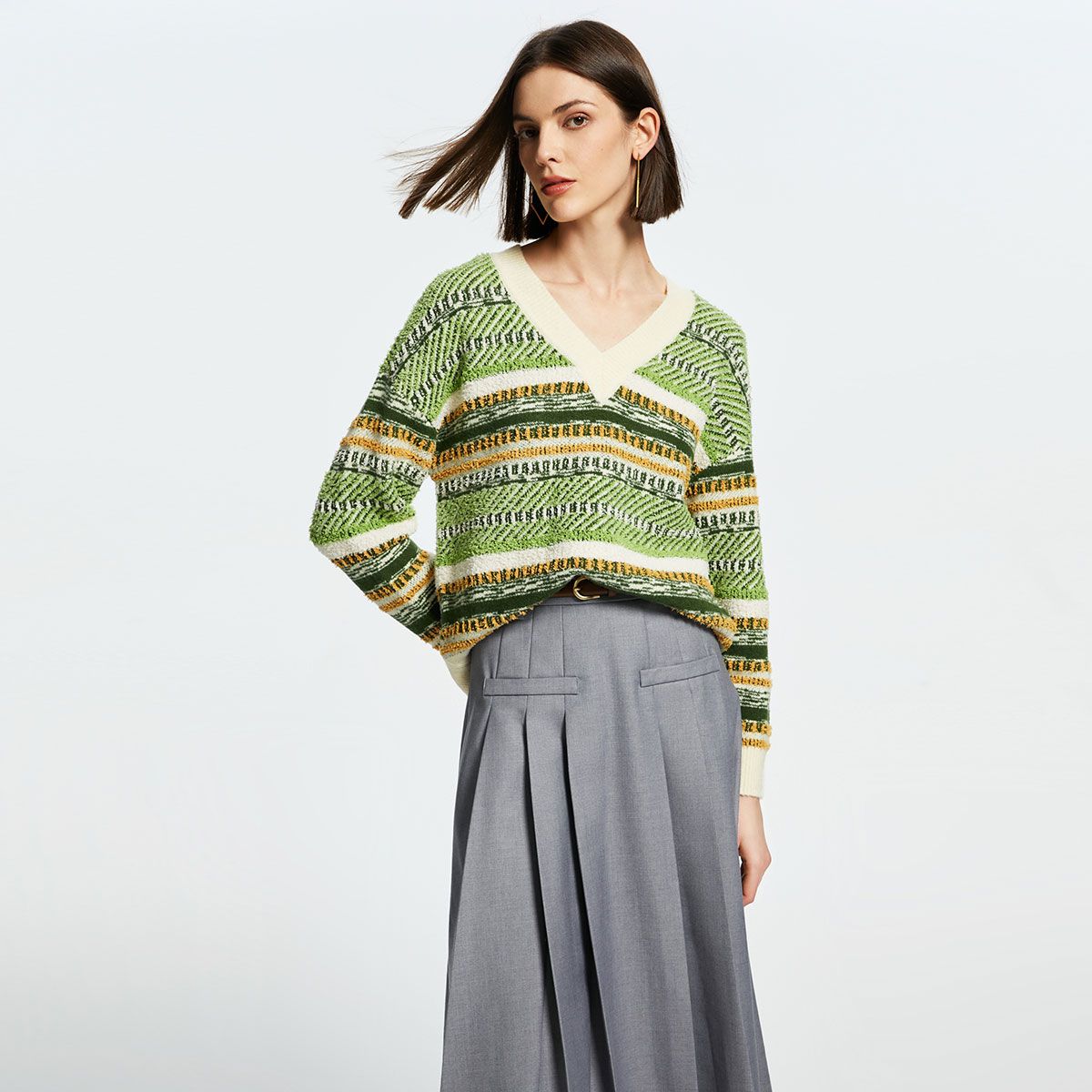 针织衫休闲舒适V领长袖杂色美拉德条纹毛衣 826449