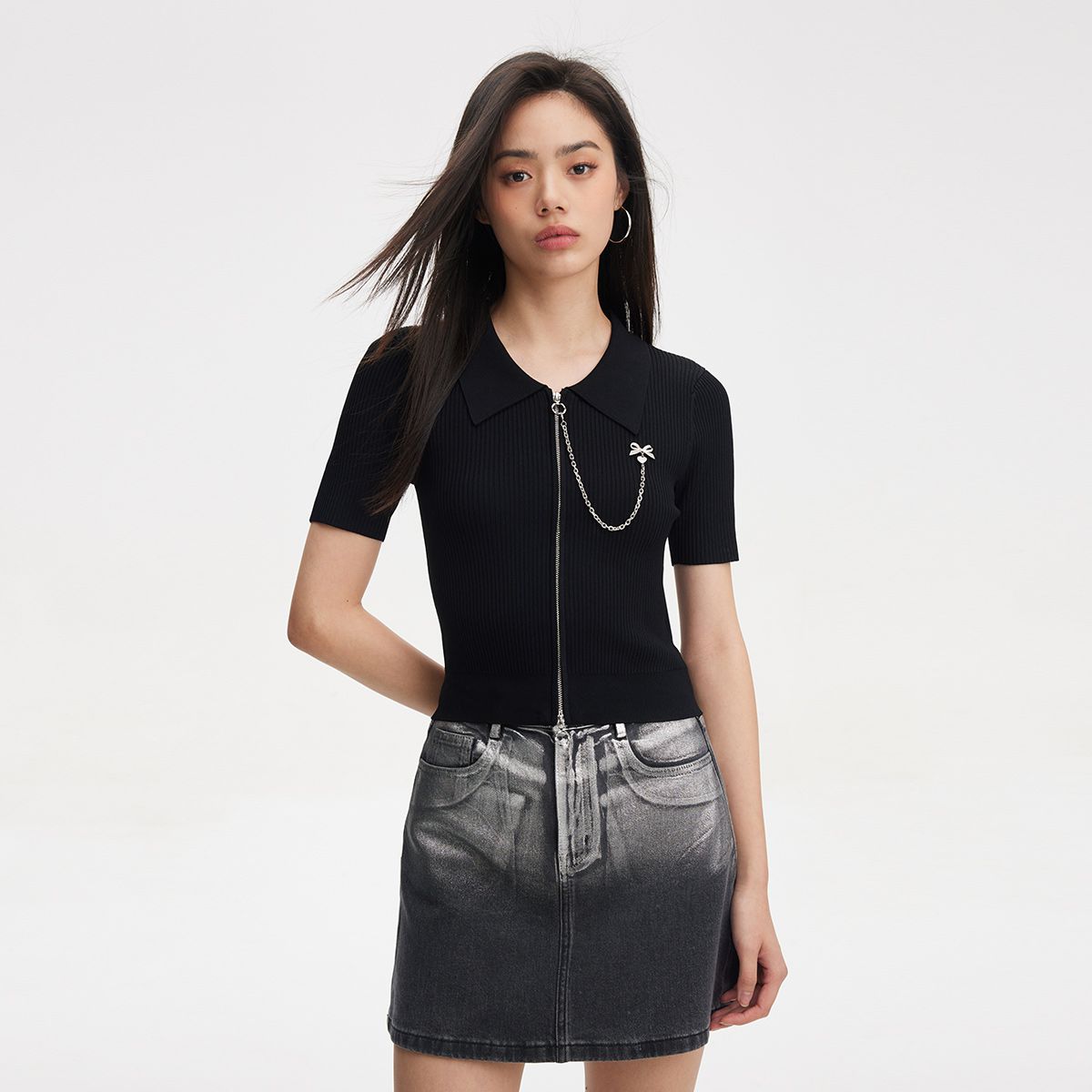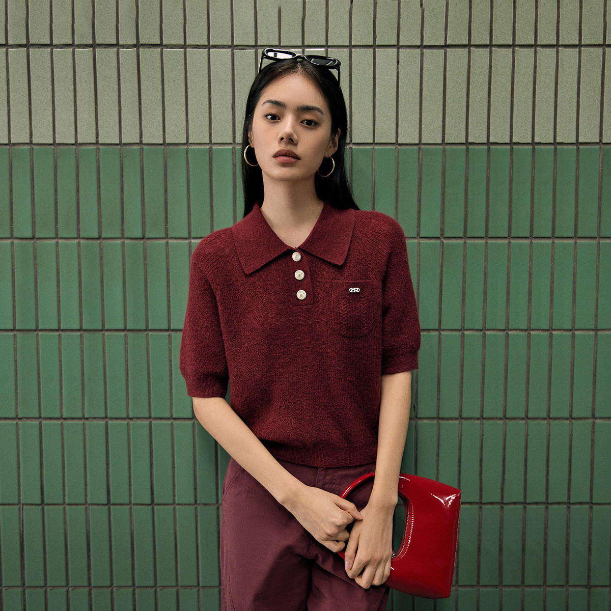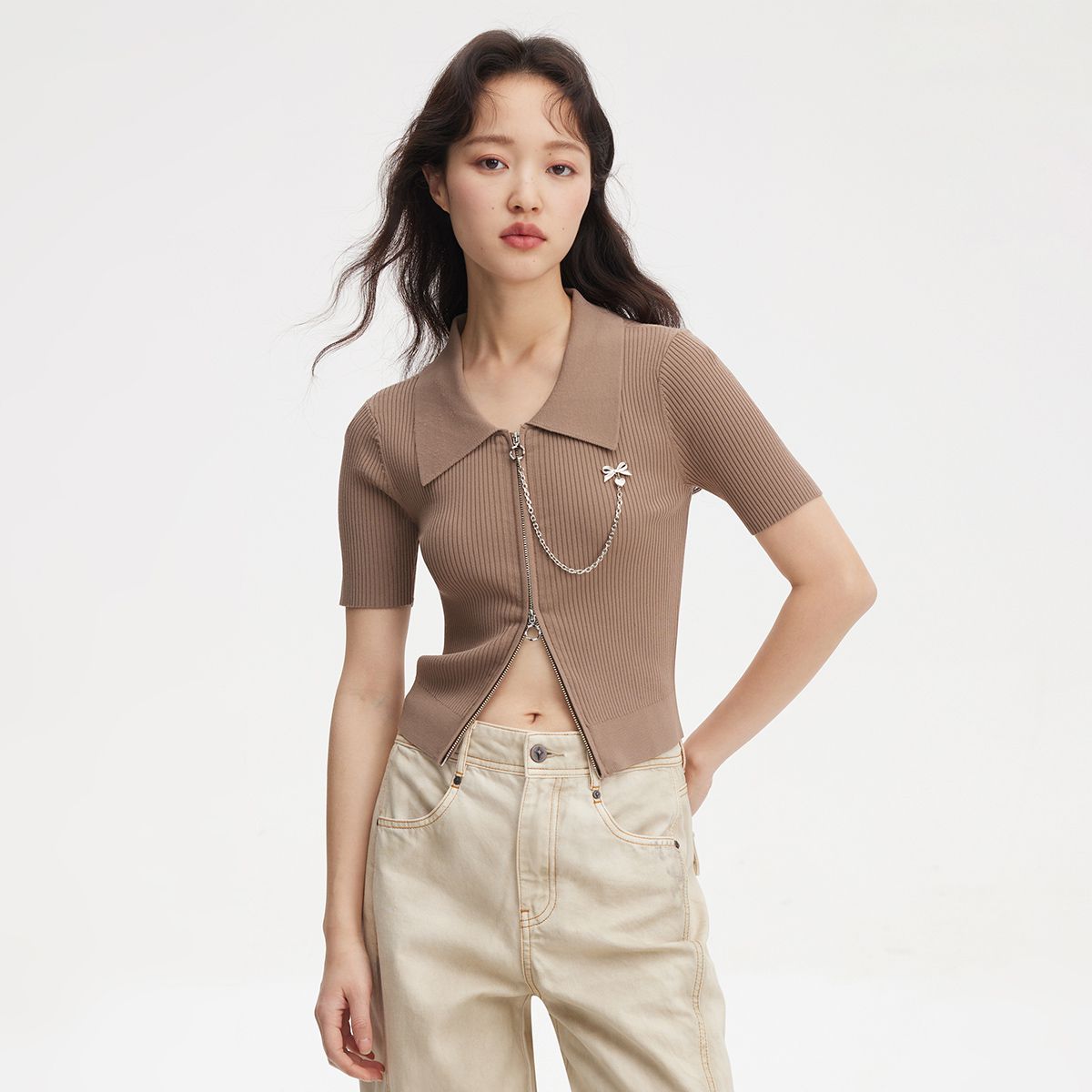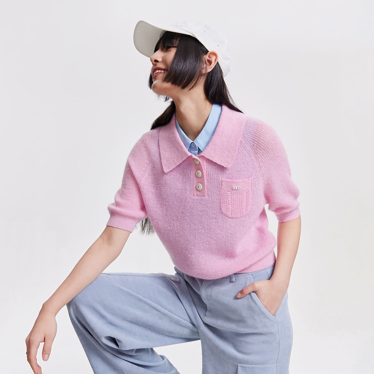【精致纽扣】春季设计感百搭纽扣Polo领短袖针织衫女 195418