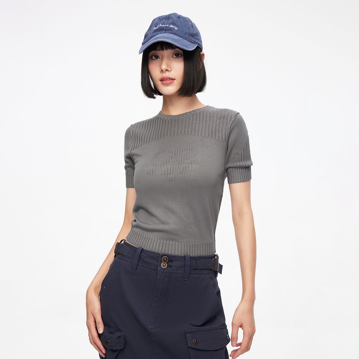 【休闲百搭】夏季螺纹纯色圆领短袖针织衫女 078938