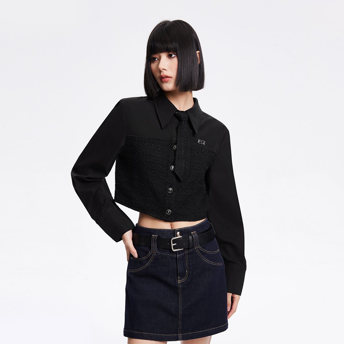 【拼接设计】春季可拆卸领带翻领短款雪纺衫女 647770