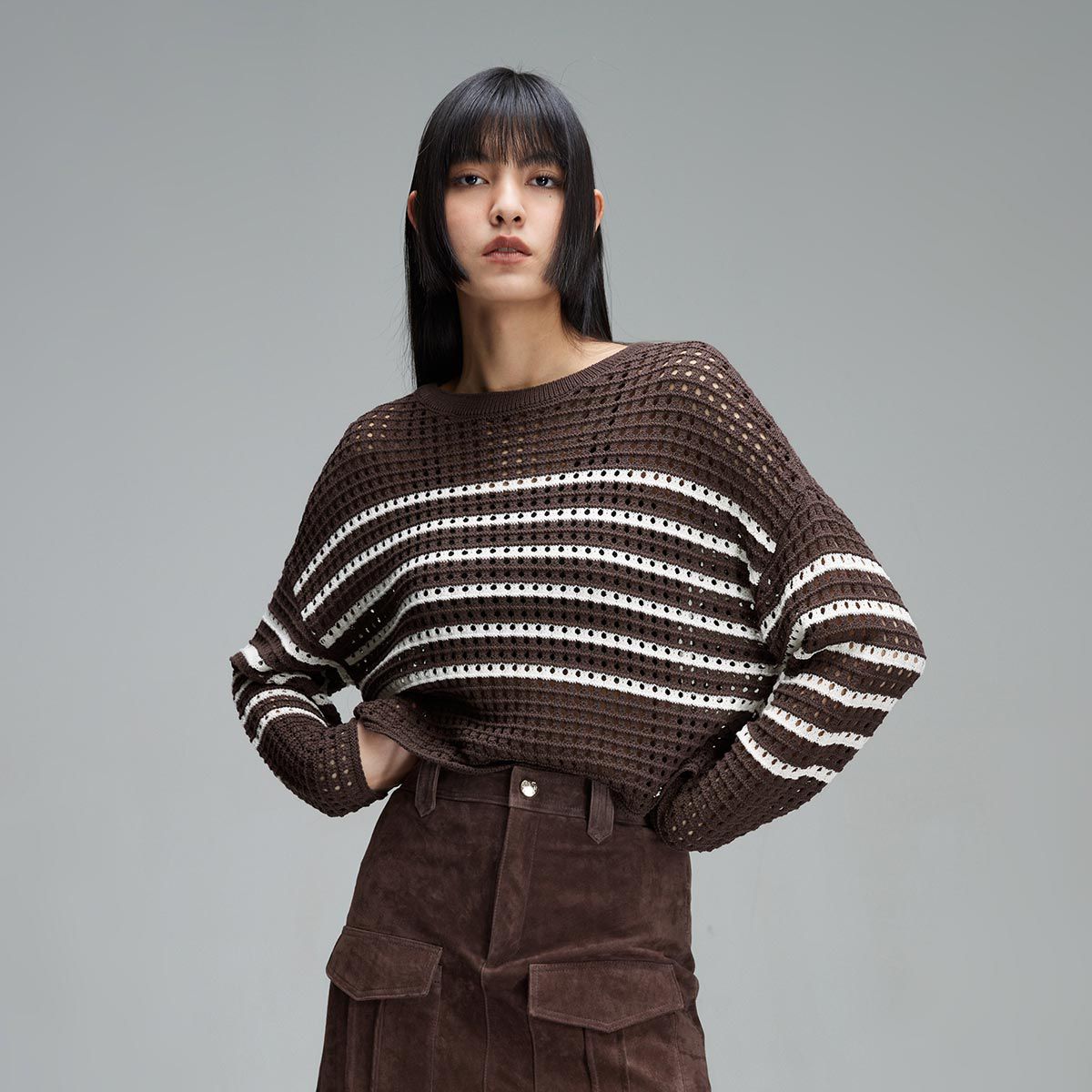 【宽松落肩】夏季镂空条纹宽松落肩短款毛衣针织衫女 854490