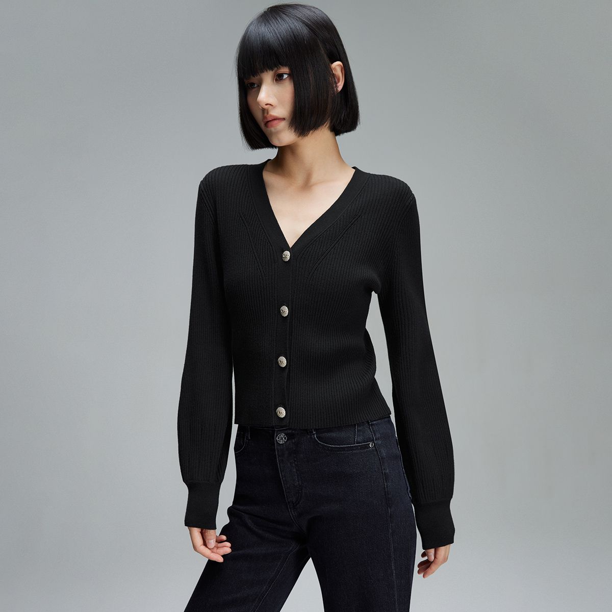 【简约百搭】春季灯笼袖V领短款开衫毛衣针织衫女 209946