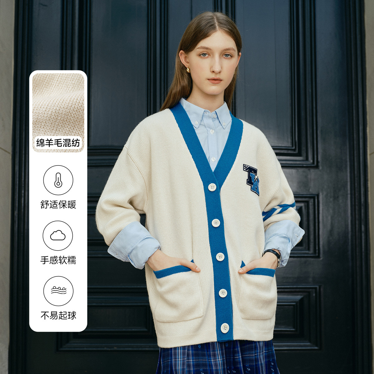 小熊春秋款绵羊毛撞色针织开衫宽松外套慵懒风好看女 442305