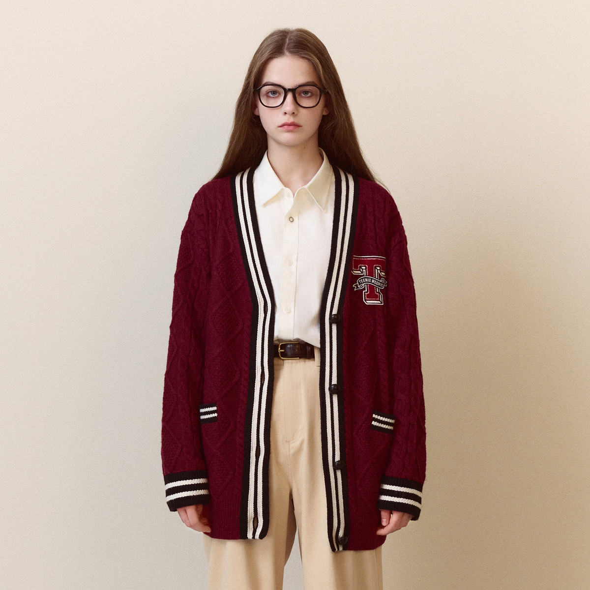 小熊春秋款红色慵懒风针织开衫毛衣外套学院风女宽松 804929