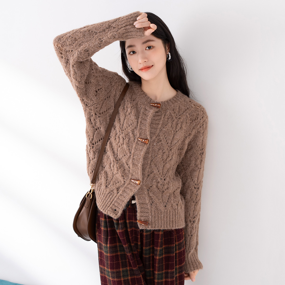 【牛角扣开衫】早春款女式针织衫上衣舒适特色提花设计感外套女 516491