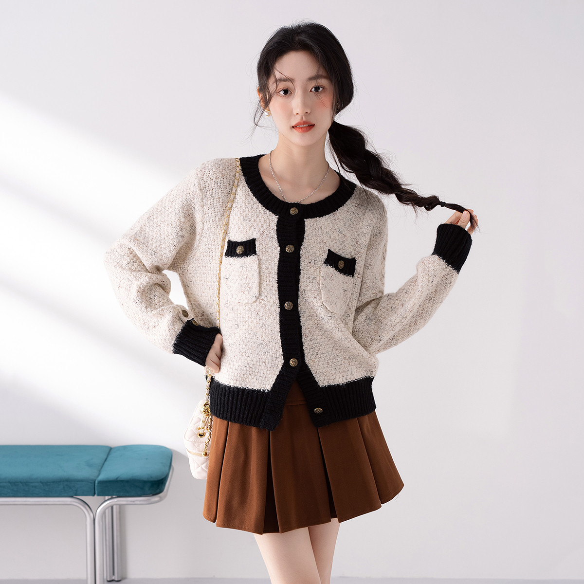 【短款法式小香风开衫女】春季款淑女撞色上衣长袖温柔女式针织衫 156043