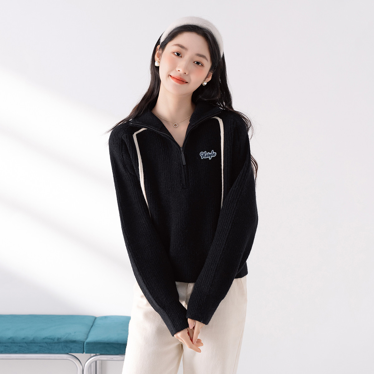 【半拉链立领套头衫】早春款条纹拼色设计感长袖上衣女式针织衫 606603