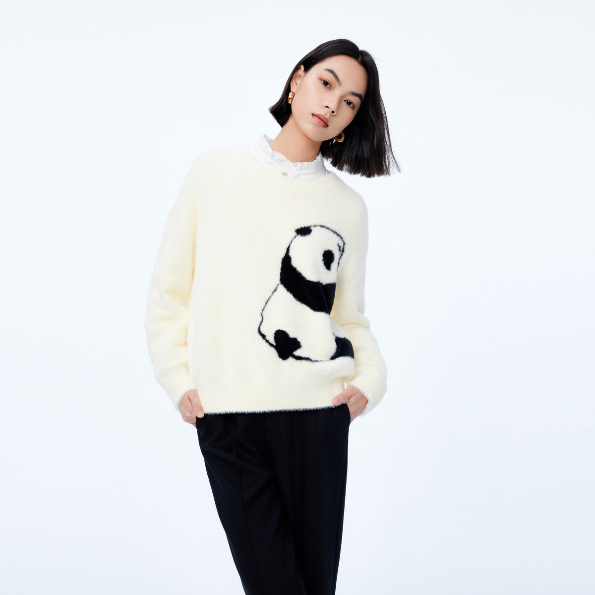 初春季温柔毛绒趣味减龄熊猫提花宽松落肩毛衣上衣女 495259