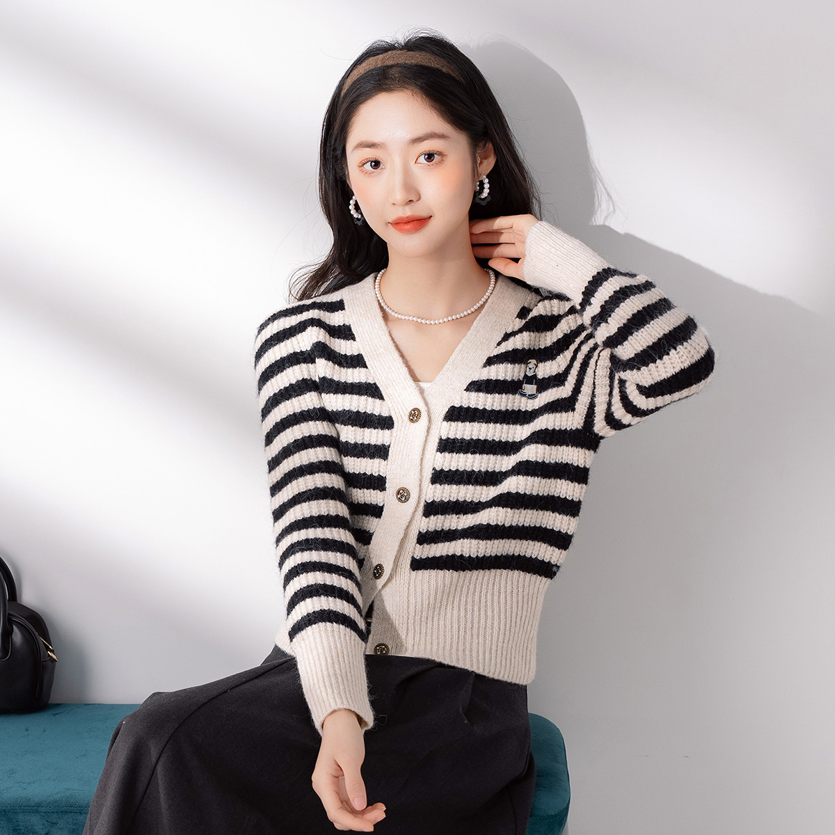 【V领条纹修身针织开衫女】早春款都市休闲风上衣长袖女式针织衫 594315