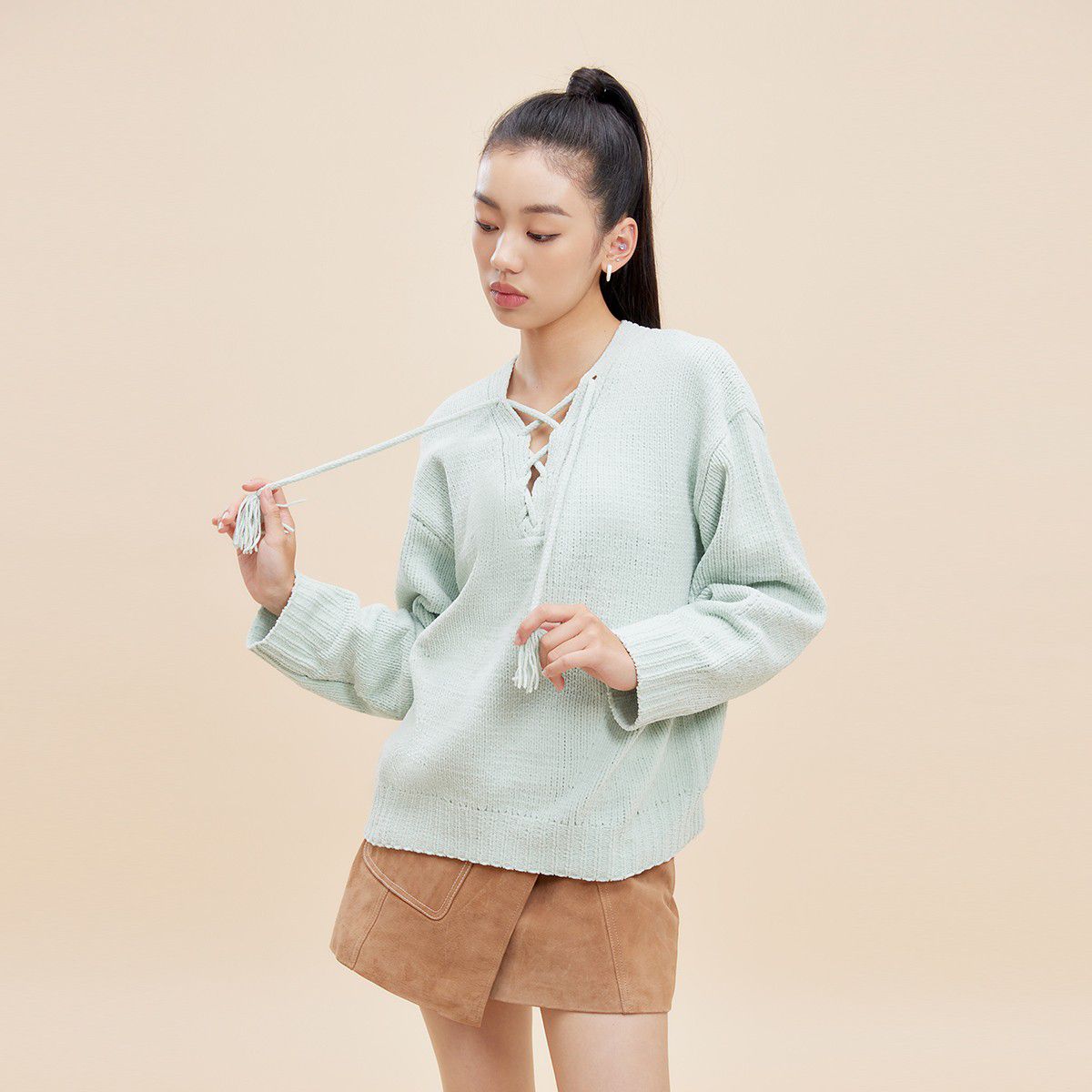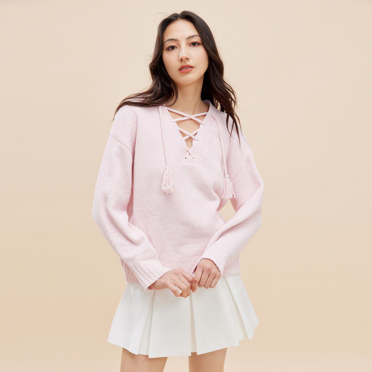 【设计感】春季时尚V领落肩宽松螺纹针织衫女 632858