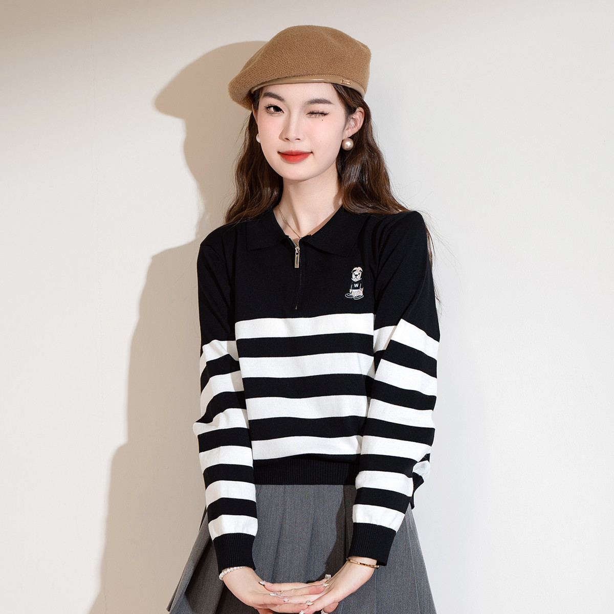 【简约粗条纹】春季款女式翻领前拉链条纹撞色休闲百搭针织衫 251787