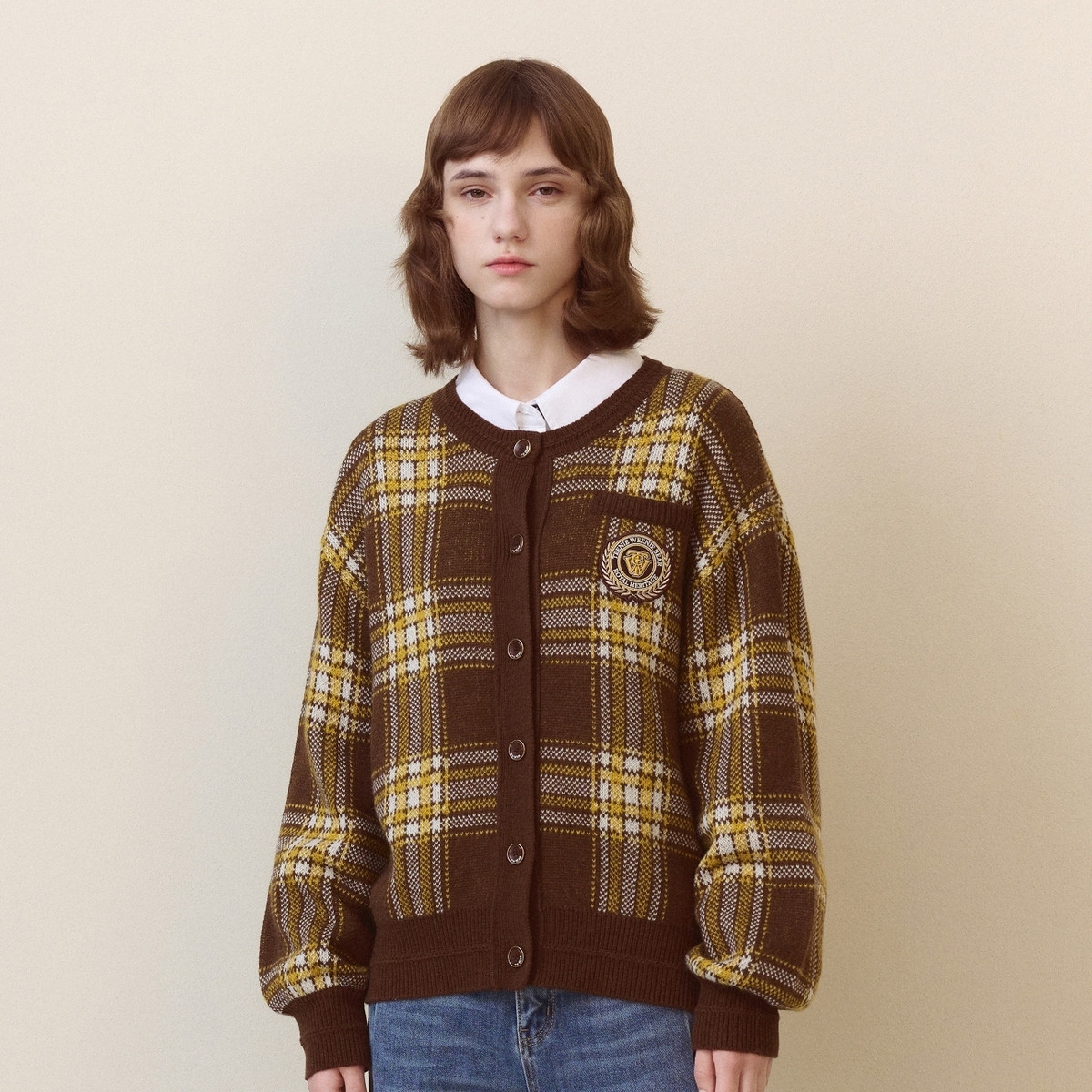 小熊春秋款时髦圆领格纹针织开衫毛衣外套女士 175425