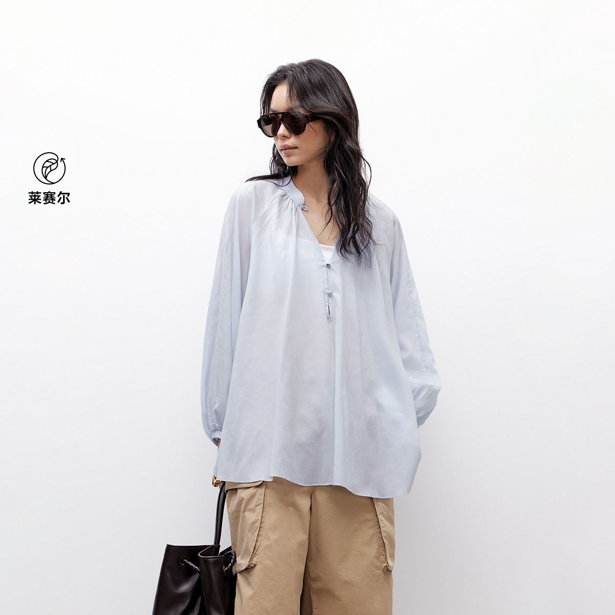 【法式泡泡袖】2025春季法式慵懒风宽松V领泡泡袖雪纺衫女 227290