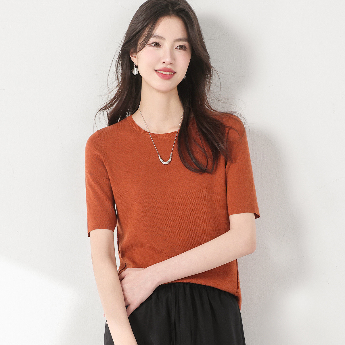 含桑蚕丝~圆领纯色薄款针织衫百搭简约短袖气质春夏款T恤打底衫 618515