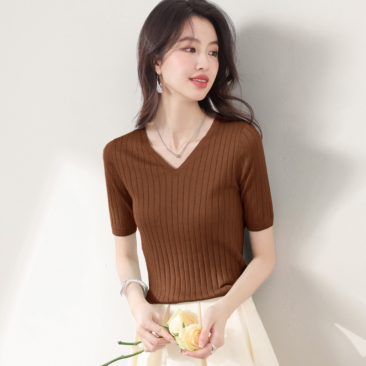 含桑蚕丝~春夏V领纯色抽条短袖针织衫女舒适气质T恤轻薄打底衫 834067