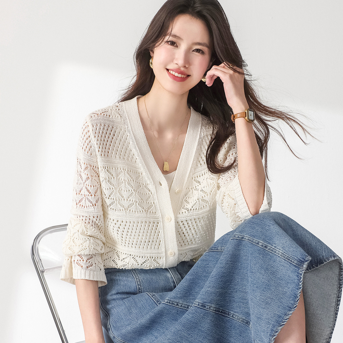 【和纸纱】V领纯色纽扣针织衫女开衫含桑蚕丝镂空夏季薄款小外套 331091