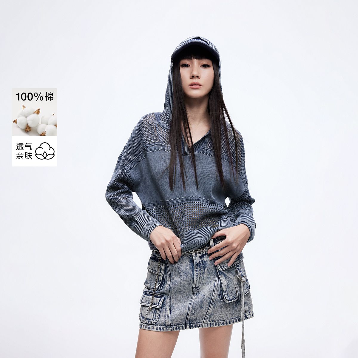 【拼接网纱】2025春季休闲百搭宽松连帽针织衫女 936218