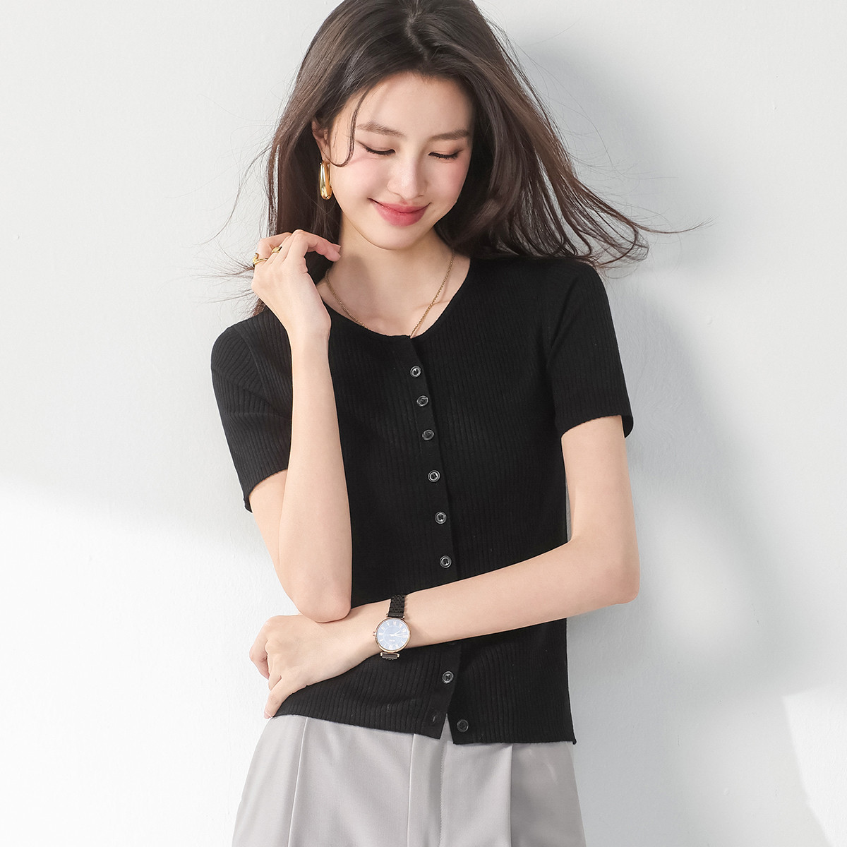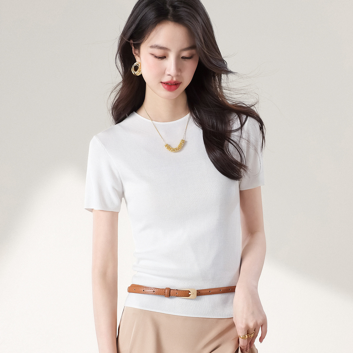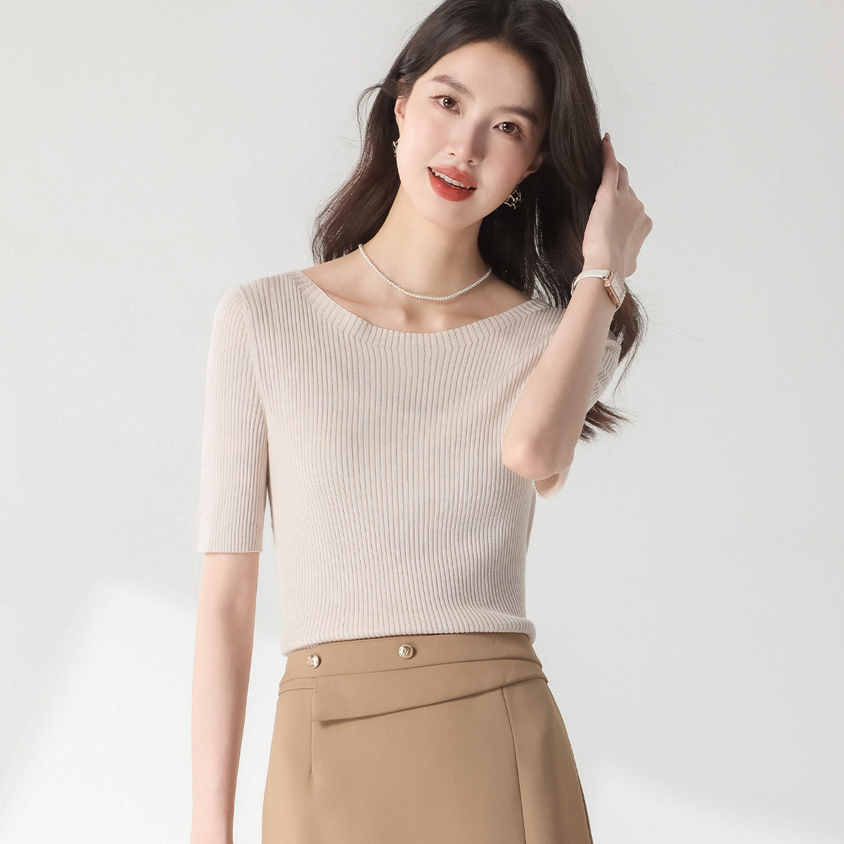 【含桑蚕丝】圆领抽条针织衫纯色简约针织五分袖T恤打底衫 942035