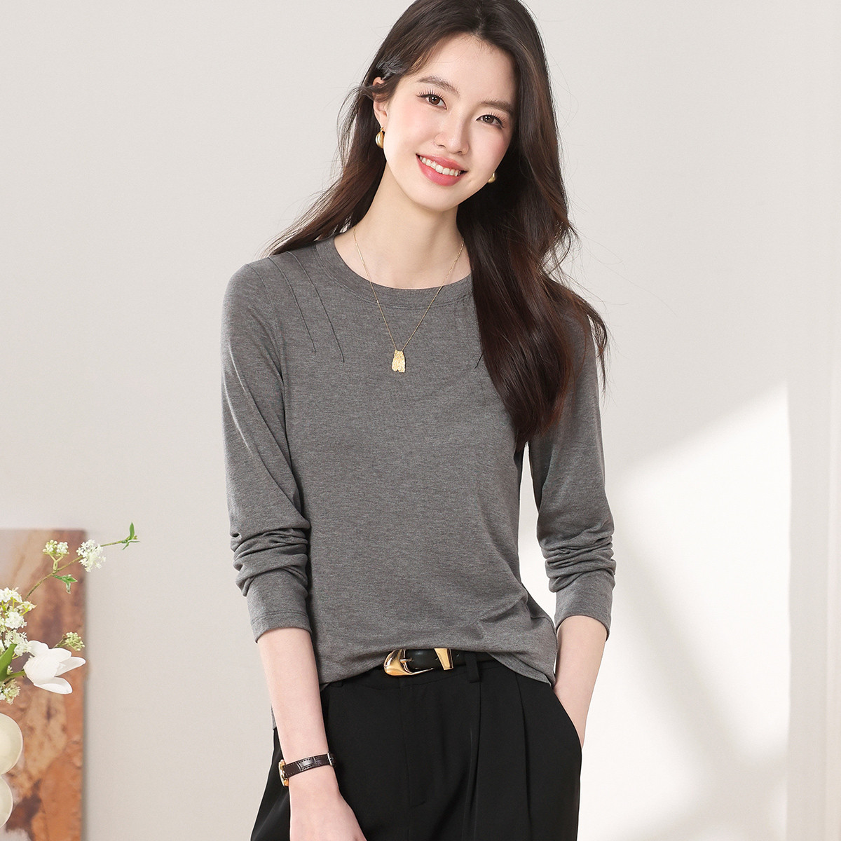 【含桑蚕丝】圆领纯色简约针织T恤女休闲百搭长袖薄款针织衫 265619