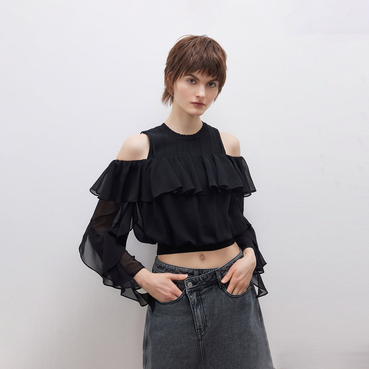 【荷叶边套装】2025春季简约针织背心蕾丝衫女 305114