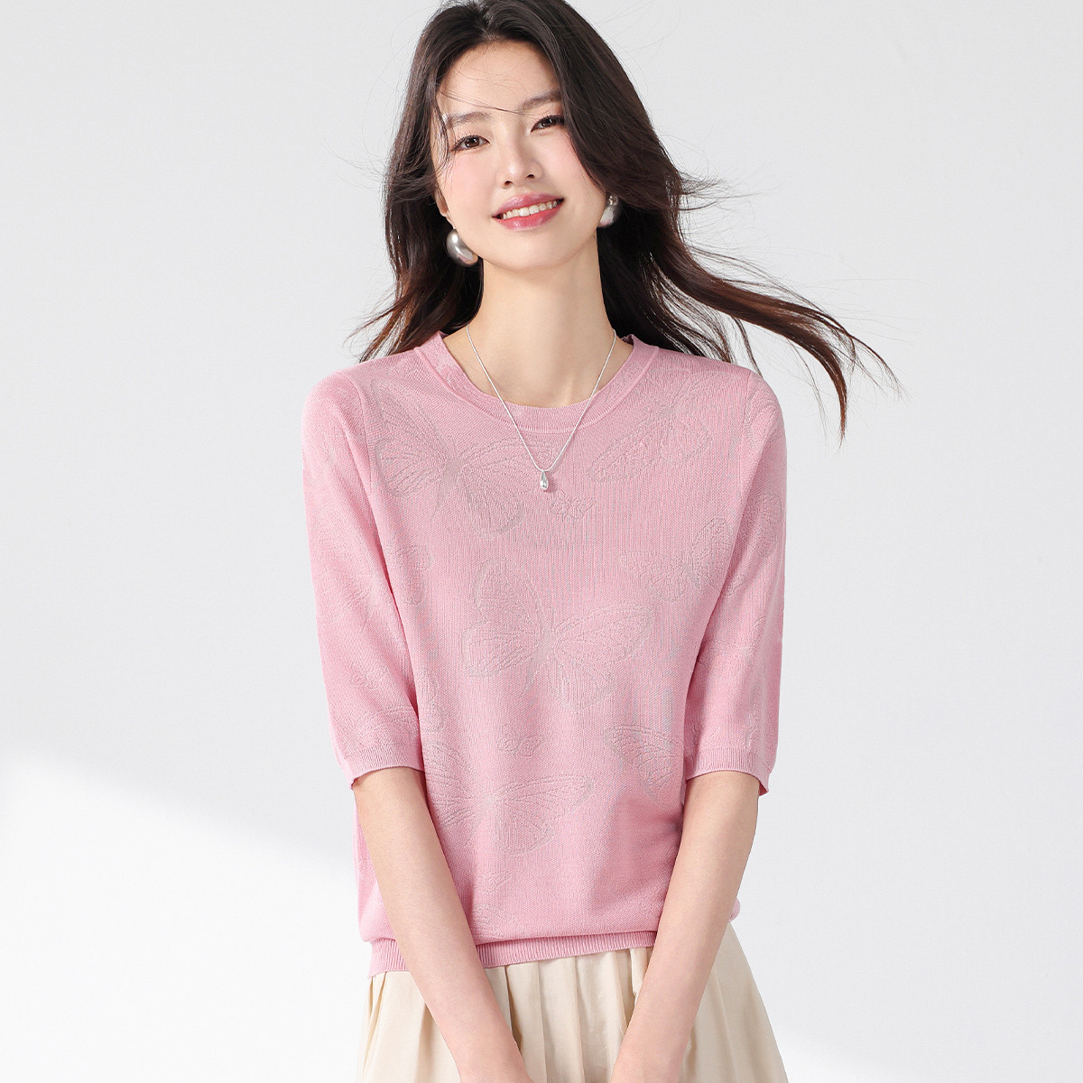 含桑蚕丝~圆领纯色针织衫女套头蝴蝶提花短袖T恤夏季薄款打底衫 339283