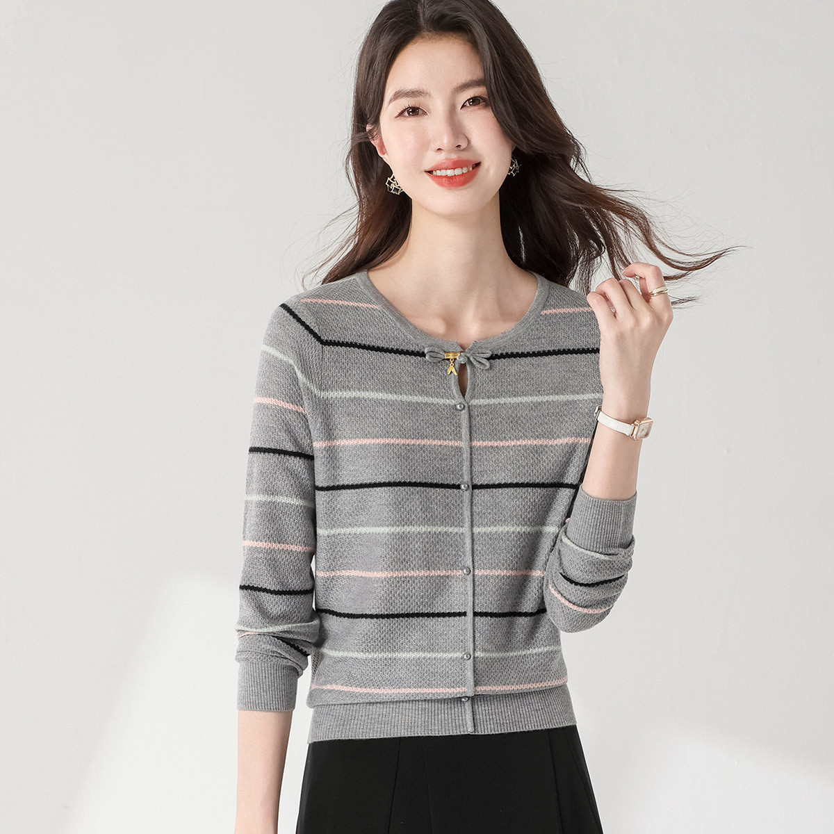 【纯色开衫】针织衫女开衫长袖坑条简约格雷灰韩系 195473