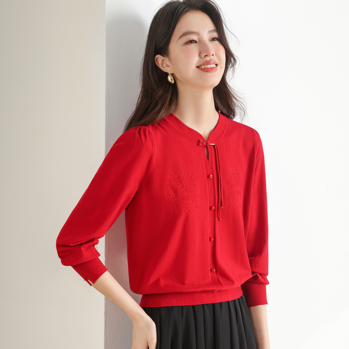 【新中式】旗袍领盘扣针织衫女套头纯色含桑蚕丝打底衫春装上衣 561107