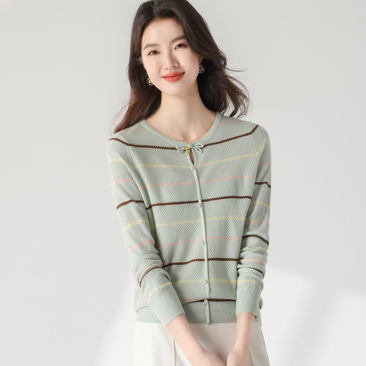 【轻薄舒适】2025夏季正肩V领长袖开衫针织衫女 244634