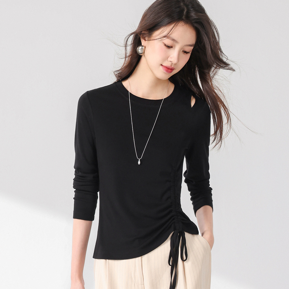 法式圆领纯色绳结针织衫女套头时尚休闲含桑蚕丝长袖T恤打底衫薄 346067