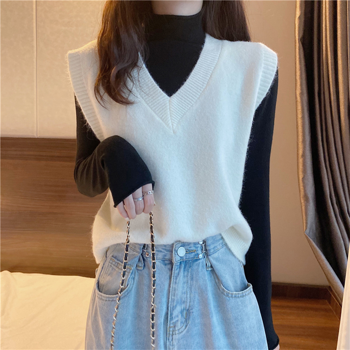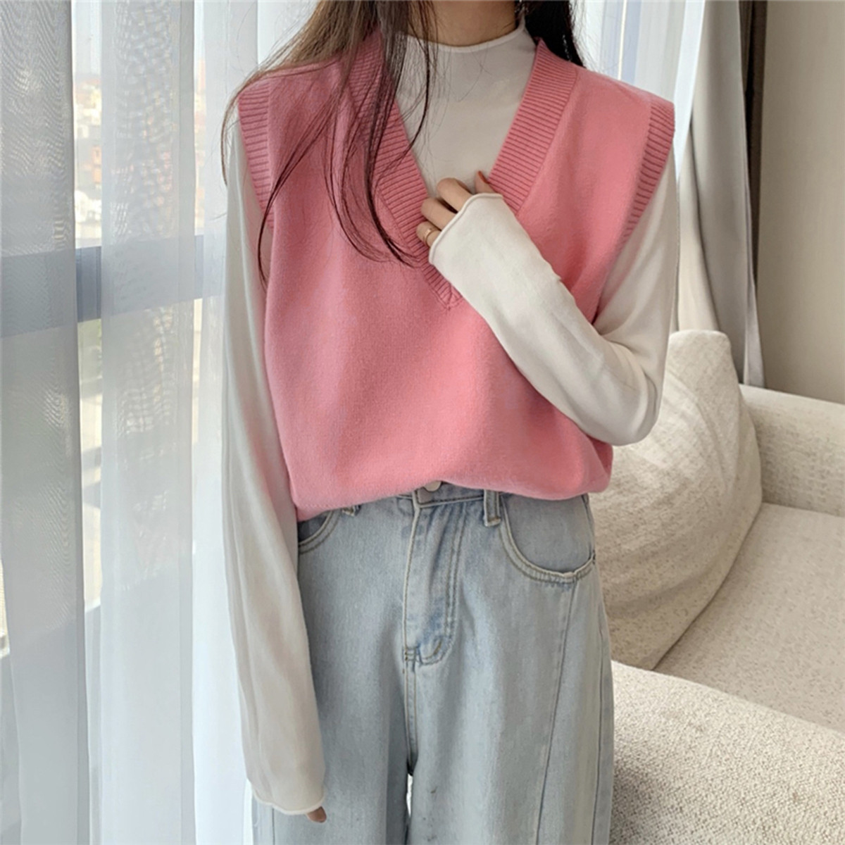 V领宽松针织上衣百搭气质短针织马甲背心女 549955