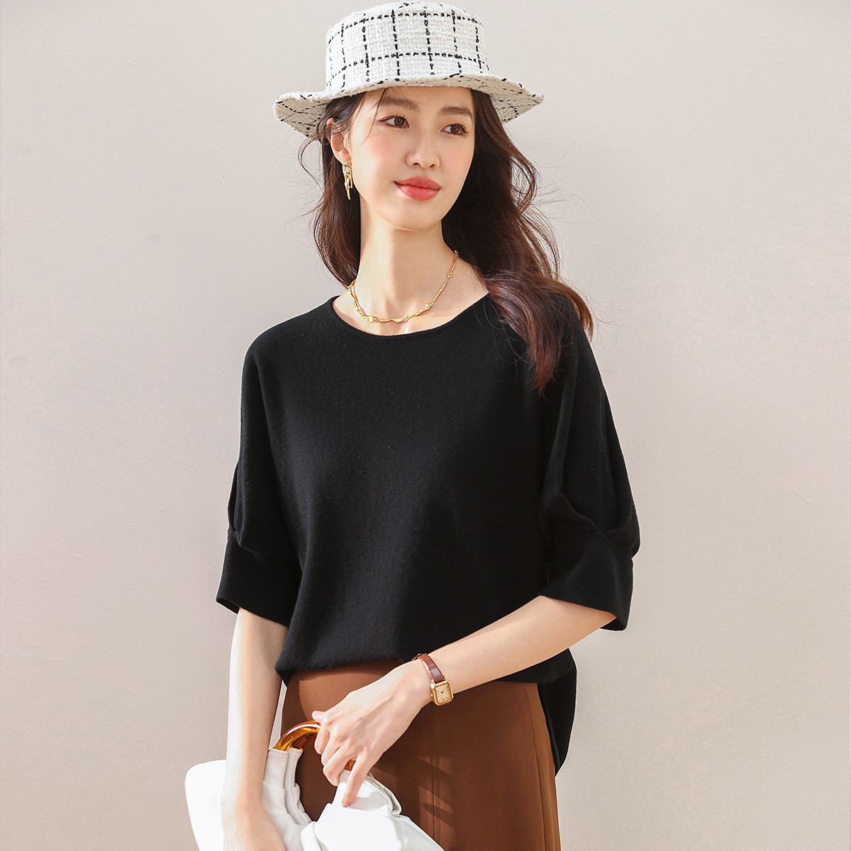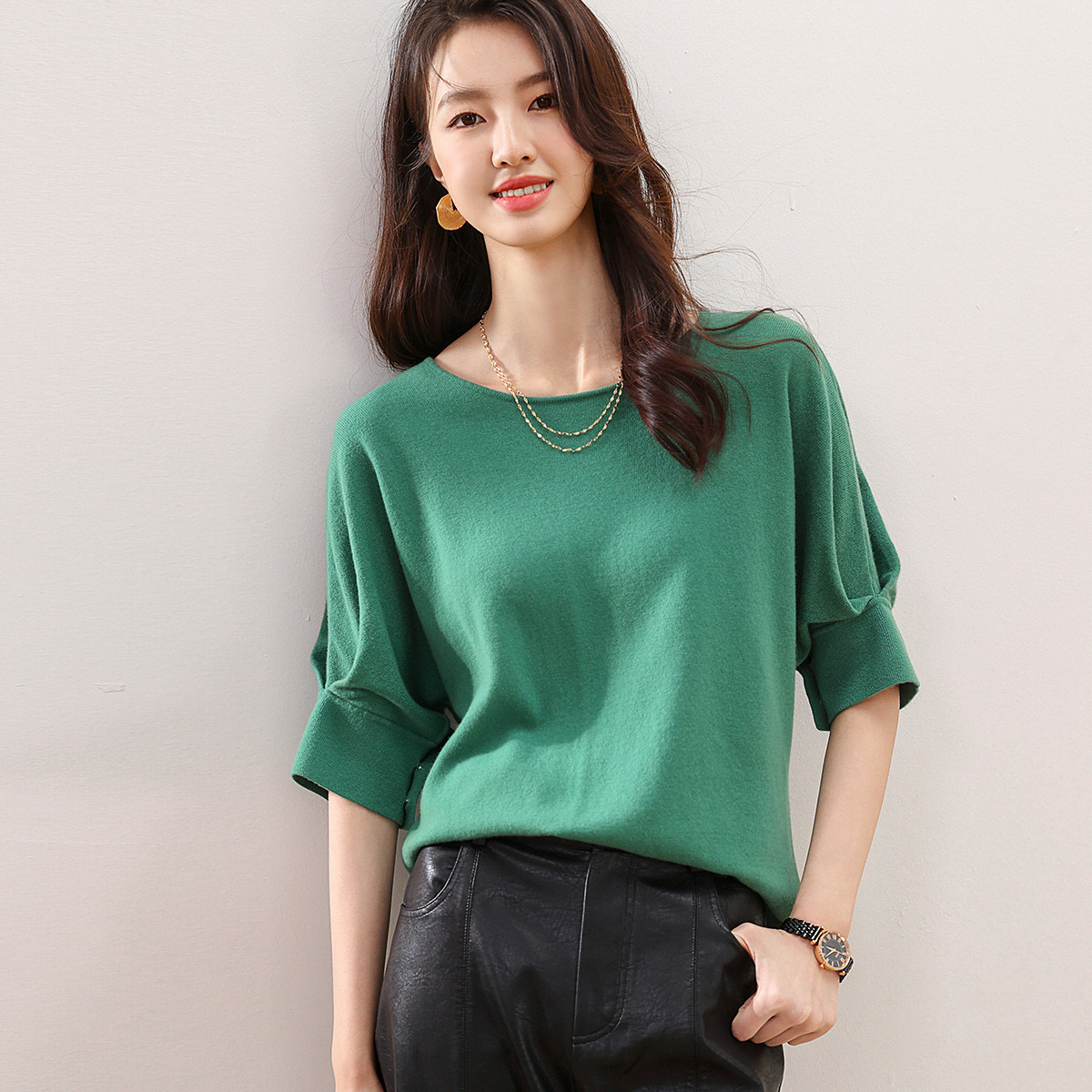 圆领纯色宽松落肩五分袖羊毛衫女T恤100%羊毛女式针织衫 052115